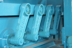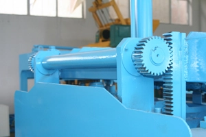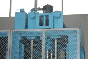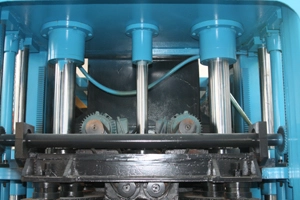 Synchronous afformningssystemet, som drives af tandhjul og kæder, får de to afformningscylindre til at arbejde synkront og får formene til at bevæge sig